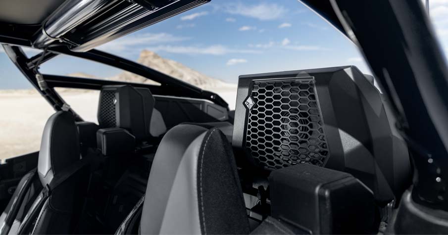 Sistema de áudio Rockford Fosgate Stage 4, ajustado de fábrica e integrado, com unidade de origem RIDE COMMAND. Inclui (1) amplificador digital de 8 canais e 1500 W, (2) tweeters de 1" e 100 W, (2) colunas frontais de componente de 6,5" e 100 W, (2) colunas traseiras coaxiais de 6,5" e 100 W, e (1) subwoofer de 10". *O Sistema de Áudio foi testado para imersão em água, com classificações IPX7 e IPX9K, para resistir a condições húmidas.